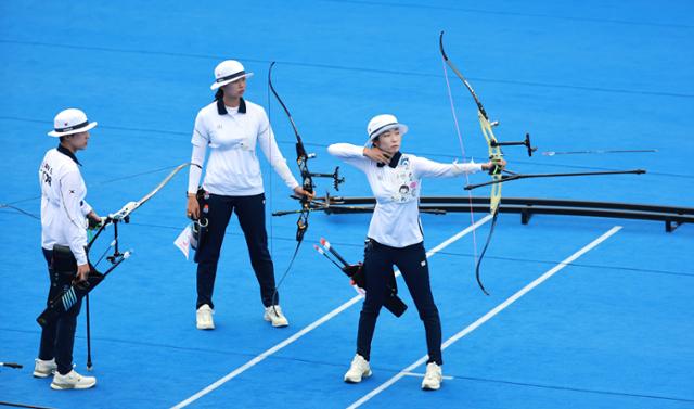 안산, 최미선, 임시현으로 팀을 이룬 한국은 6일 중국 항저우 푸양 인후 스포츠센터에서 열린